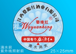 滴水消失防偽標(biāo)簽是利用特殊印刷油墨和特殊的制版工藝來(lái)實(shí)現(xiàn),印出文字或者圖案,或者將其隱藏,肉眼無(wú)法識(shí)別,只能借用水滴,水滴和油墨相互發(fā)生反應(yīng)達(dá)到預(yù)想效果。