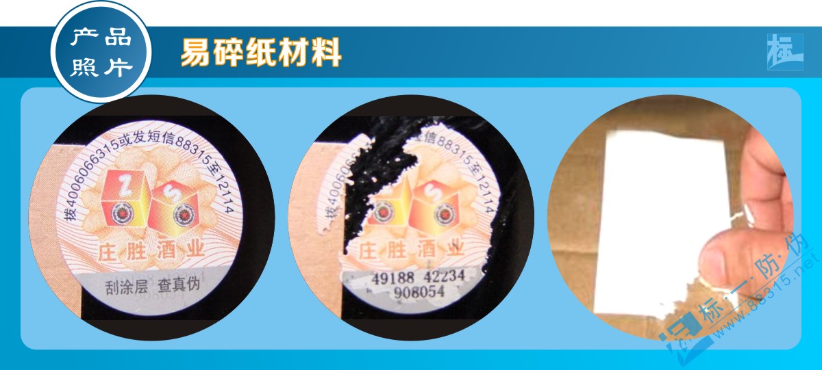 易碎紙不干膠標(biāo)簽其面料斷裂強(qiáng)度遠(yuǎn)低于膠粘劑粘合能力,它具有粘貼后不能完整剝離、不可再利用的特點(diǎn)。易碎紙不干膠面材經(jīng)印刷﹑模切等工序加工后,制成易碎標(biāo)簽或易碎貼,也稱(chēng)商品易碎質(zhì)保貼,也可以用它來(lái)制作各類(lèi)電碼防偽標(biāo)簽或二維碼防偽標(biāo)簽,從而提升其防偽性能。