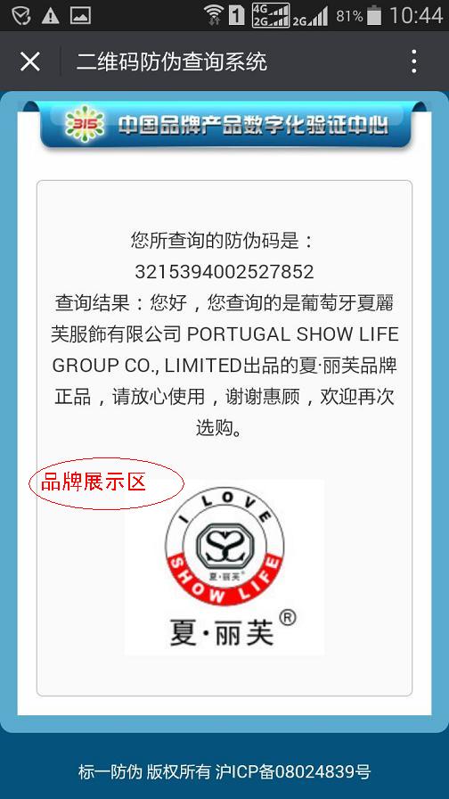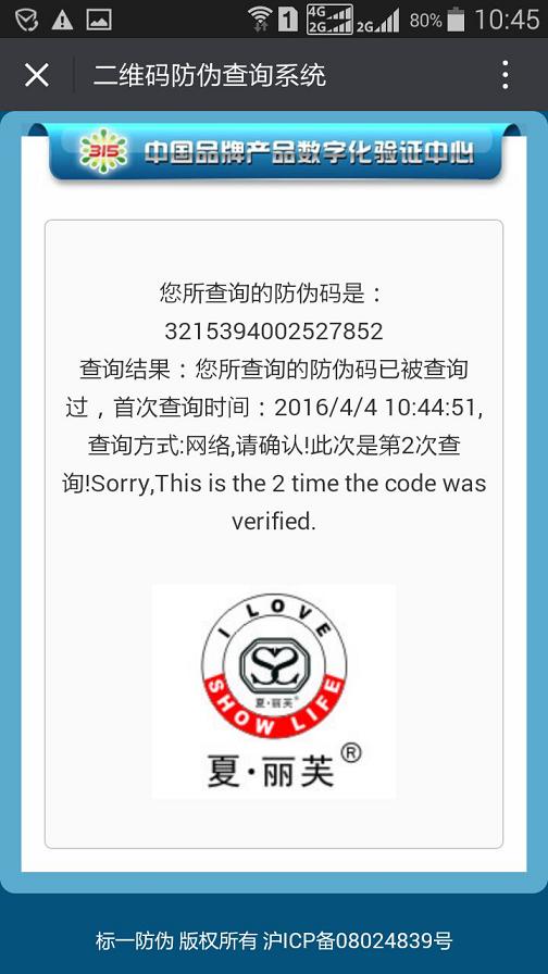 可變二維碼即每個標簽上的二維碼都是不一樣的,不重復,只能一次查詢有效等特性,其查詢結果的頁面有兩種情況,一是用我公司提供的標準化通用型的頁面,二是通過定型個性化的查詢結果頁面。以下主要介紹有關通用型的案例及相關過程結果。